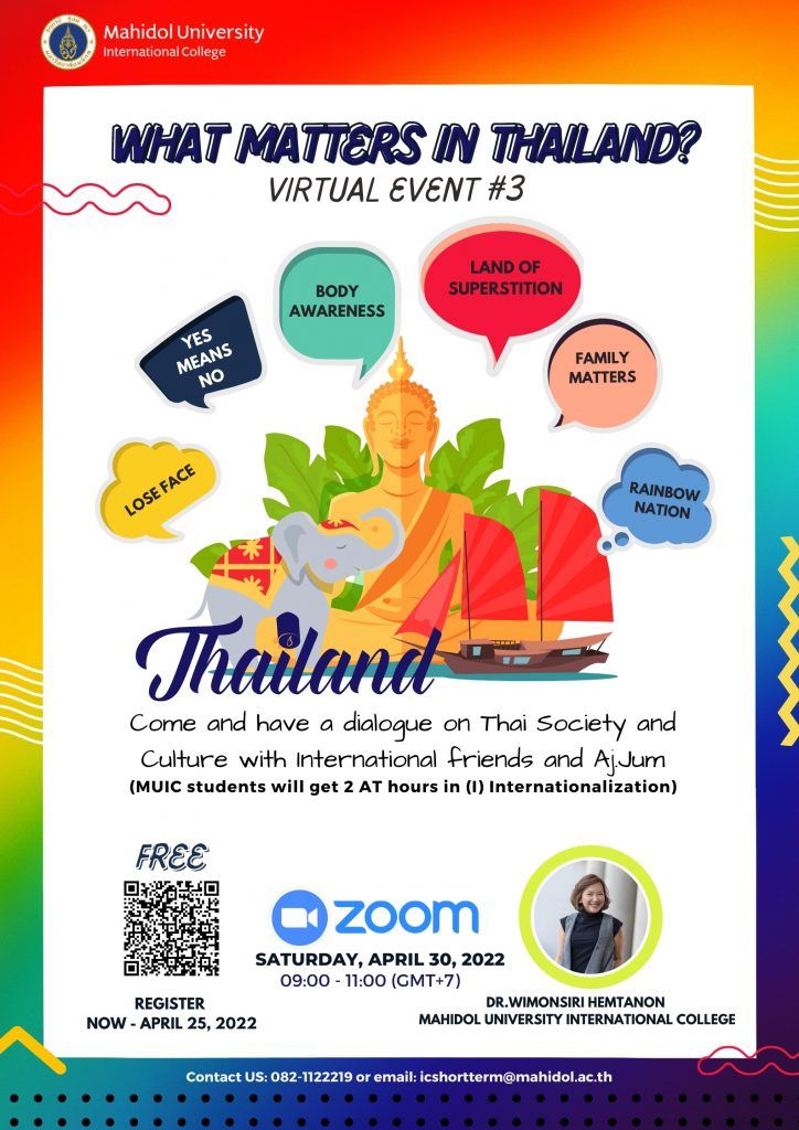 Project Development Unit would like to invite MUIC students to join the virtual event and have a dialogue with international students on “What matters in Thailand?” led by Aj. Wimonsiri Hemtanon.